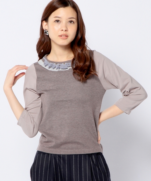 ニット×カットソー フラワー装飾プルオーバー☆ 身頃部分はニット、袖はカットソーで切り替えた素材のコンビに、襟元の装飾がスタイリングの主役になってくれるトップス。 今年らしいきゅっと詰まった首もとに、キラキラと輝くビジューとテープ使いが華やかなデザインは、アクセサリーをしなくても顔回りを華やかに演出してくれます。 コンパクトなシルエットでパンツスタイルにもスカートスタイルにも合わせやすく、様々なスタイリングで活躍してくれる一枚です。 ※着用、お取り扱いの際は商品についておりますアテンションタグ、洗濯ネームを必ずご確認ください。 店舗にお問い合わせの際は、全国のAnother Edition店舗まで 下記の品名/品番をお申し付け下さい。 品名:AE KNIT×CUT FLW ソウショク 品番:56131990686