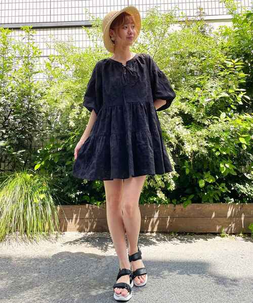 <POINT> 花モチーフの柄がお洒落なチュニックが登場! ティアードデザインになっているので裾にかけて広がるシルエットが可愛い♪ 胸元がレースアップもさりげないポイント! ガーリーにも着こなせるチュニックです☆ <STYLE> 1.チュニックブラウスとしてロングパンツを合わせてカジュアルに 2.チュニックワンピとしてショートボトムを仕込んでガーリーに どちらの印象でも楽しんで頂けます☆