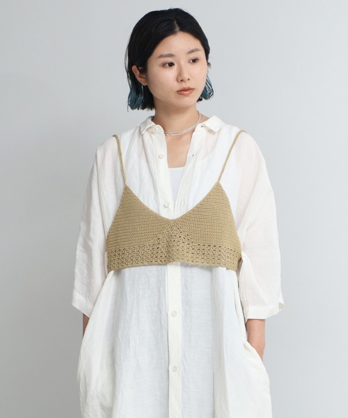 コリッとしたリネンの糸を使用し、一目一目かぎ針を使ってお作りした手編みのシリーズ。 籐の編みかごのように少し優しい表情。機械では作ることのできない、素朴な雰囲気が魅力です。 ベージュ / パープル / 黒のきりりとしたカラーパレット。プレイフルなニットブラ。素朴さと女っぽさのバランスが、新鮮に感じます。編み地を組み合わせ、繊細さが出るように気を配りました。Tシャツやワンピースに、ラフにつけるコーディネートがおすすめ。同シリーズでニットキャミ【2201KN016211】も展開しています。洗濯:ドライクリーニング※画像はサンプルです。実際の商品と仕様・加工・サイズなどが若干異なる場合がございます。※撮影画像は、光の当たり具合やモニターの環境により色味が違って見える場合があります。あらかじめご了承ください。※取り扱いの注意については取り扱い表示をよくご確認の上、着用をお願いいたします。