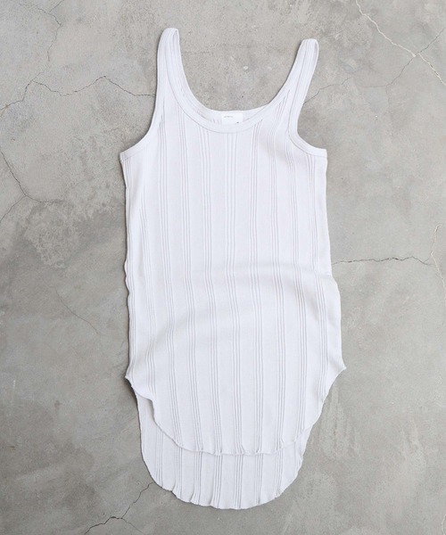 ランダムな柄のテレコ生地。製品染めでラフに仕上げ、ヴィンテージ感を出しました。 ホワイト / グリーン / ボルドー のアッシュカラーのカラフルパレット。バインダー始末や振りミシンでラフに仕上げたシンプルなタンクトップ。裾がラウンドになっているので、上から重ね着していただくと。裾からちらりと見せることができます。同色のチビ丈Tシャツ【2201CT011211】とのレイヤードスタイルがオススメ〇同シリーズでアシメチュニックT【2201CT013211】も展開しています。洗濯:手洗い可※画像はサンプルです。実際の商品と仕様・加工・サイズ等が若干異なる場合がございます。※撮影画像は光の当たり具合やモニターの環境により色味が違って見える場合がございます。※取り扱いの注意については取り扱い表示をよくご確認の上、着用をお願い致します。