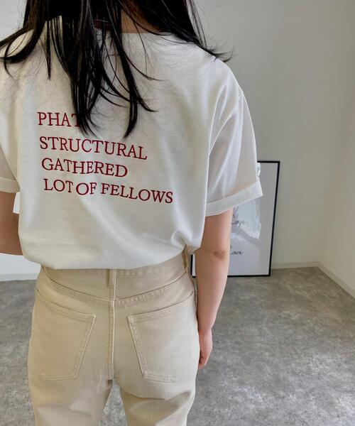 2021 春夏アイテム WEB限定 バックにあしらった刺繍ロゴがスタイリッシュなTシャツ。刺繍でカラーアクセントをプラスしたデザインで大人ラフに着られるアイテムに仕上げています。ベーシックなシルエットでどんなボトムスにも合わせやすくデイリーに活躍。フロントは胸元の刺繍ロゴのみでシンプルに。ふんわりスカートはもちろん、キレイめパンツを合わせて大人っぽく着こなすのもおすすめです。・伸縮性あり