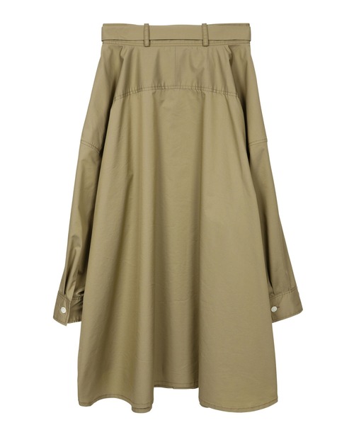 【素材感】コットン100%以上に適度なハリとストレッチ性のあるコットン・ポリエステルを使用。着込むことによるダレも少なく、洗濯後もシャキっとした表情が残ります。【デザイン・ポイント】オーバーサイズのシャツを穿いたような個性的なデザインのスカート。シャツとしても着用可能で、ウエストのベルト部分を開くとデコルテラインが見えるデザインです。【コーディネイト】かなりデザイン性の高いスカートなので、トップスはシンプルでコンパクトにまとめたい。
