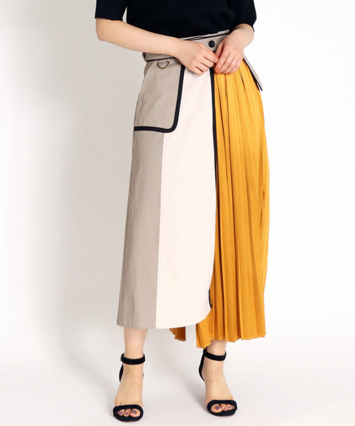 大胆に異素材で切り替えたスカート。シンプルなトップスに合わせるだけで、こなれたスタイリングが叶うスカートです。ベルトがウエストを強調してくれて、着やせ効果も◎プリーツ部分は光沢感もあり、カジュアルからキレイ目まで幅広いコーディネートが楽しめます。