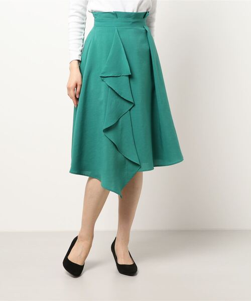 フロントにラップ風のフリルがポイントのスカート。後ろゴムで履きやすく、コーディネートの差し色にもぴったり。