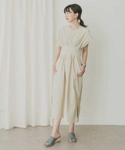 【ランダムタック×構築的なシルエットが目を惹くモード顔ワンピース】 KBF+が得意とするスタイルアップワンピースが登場。ウエストのランダムタックで存在感を引き上げています。また、少しハリのある素材を使用することで構築的なストレートシルエットを実現。女性らしくありながらも甘さを抑えたおすすめの1着です。 POINT ・フレンチスリーブ&ウエストマークデザインでスタイルアップ ・ハリ感のある素材でモードな雰囲気をプラス ・甘さを抑えるストレートシルエット COORDINATE 潔く1枚着がおすすめですが、雰囲気を変えたい時はカットパンツなどを合わせていただいても◎シワが気になりにくいのでデイリーユースに最適です。 ※この商品は、長時間強い日光や照明を受けますと、変色するおそれがあります。ご着用や保管の際は、充分にご注意ください。 ※強い力がかかると、破れる場合があります。着用時は、他のものとの引っ掛けにご注意ください。 ※商品画像は、光の当たり具合やパソコンなどの閲覧環境により、実際の色味と異なって見える場合がございます。予めご了承ください。 ※商品の色味の目安は、商品単体の画像をご参照ください。 ----------------------------- 透け感:なし 伸縮性:なし 裏地:なし 光沢:なし ポケット:あり -----------------------------