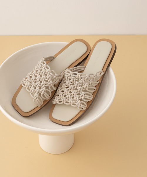 ラフなのにおしゃれ見え。マクラメ編みのクリーンなクラフト感が旬ムードを高めてくれるフラットサンダル◇2021春夏◇ADAM ET ROPE' FEMME【Material】アッパーはコットンコードを編み込んだものを使用し、中底にはエコレザーを使用。【Design】ひとつずつ手編みによって作られるマクラメ編みがクラフト感あふれるフラットサンダル。ナチュラルなアッパーデザインを、スクエアのソールがきりっと引き締め、都会的なムードに。編み目からのぞく素肌が涼し気で、夏の足元にぴったりの一足。【Color】ナチュラルになりすぎず、大人っぽくクリーンに合わせやすい、ブラック、キナリ、ベージュの3色展開。【Styling point】リネンのパンツやワンピースなど、ナチュラル素材に合わせると、足元に抜け感がうまれ、クリーンなコーディネートに仕上がるのでおすすめ。サンダルがベーシックカラーなので、ネイルで色を差していただくのが◎※手編みのアッパー部分は、履いていくほどに若干伸びていくことで、足の形に馴染みます。※画像の商品はサンプルです。お届けする商品に仕様・サイズ等の変更が生じる場合がございます。予めご了承ください。※ロケ撮影画像は、光の当たり具合で色味が異なって見える場合がございます。商品の色味は、スタジオ撮影の画像をご参照ください。