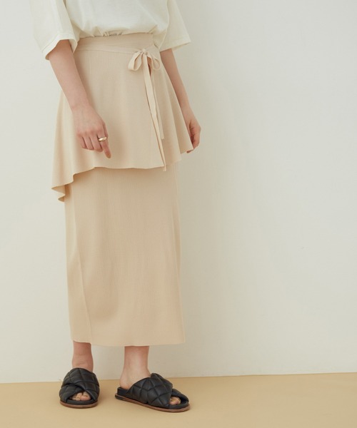 《2WAY》上品でなめらかな質感が魅力。大人かわいいが叶う涼しげニットスカート◇2021春夏◇ADAM ET ROPE' FEMME【Material】なめらかな肌触りが気持ち良い、レーヨンナイロン混の糸を使用。【Design】すとんと落ちるIラインシルエットのペンシルスカートと、後部分のボタンで着脱可能なラッフルベルトがセットになったニットスカート。ベルトを付けずにスカートのみですっきり着ても素敵な一着。ベルトを付ければ、ウエストまわりにアクセントを付けつつ、気になるヒップまわりの目隠しにも。【Color】コーディネートになじむエクリュと、大人っぽくシックな合わせが叶うダークブラウンの2色展開。【Styling point】 カジュアルなフォルムのカットソーやTシャツとの合わせがおすすめ。サテン素材のトップスと合わせて、スカートとの異素材感を楽しむコーディネートも◎。---------------裏地:なし光沢感:なし透け感:なしウエスト:ゴムポケット:なし伸縮性:あり生地の厚さ:やや厚手洗濯方法:手洗い可---------------※画像の商品はサンプルです。お届けする商品に仕様・サイズ等の変更が生じる場合がございます。予めご了承ください。※ロケ撮影画像は、光の当たり具合で色味が異なって見える場合がございます。商品の色味は、スタジオ撮影の画像をご参照ください。