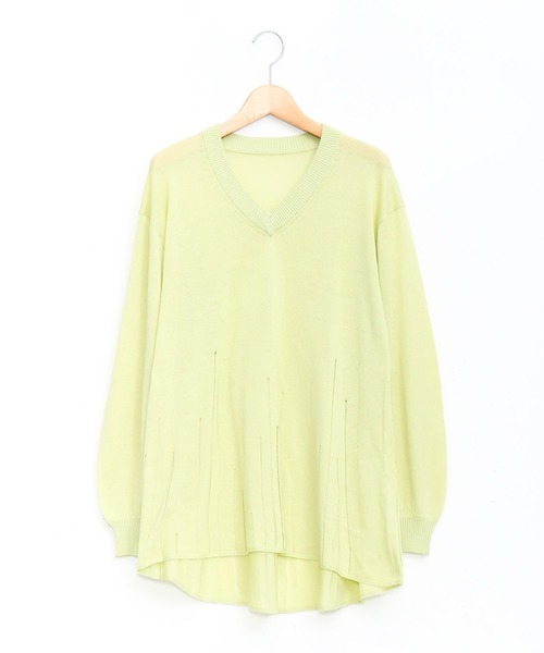 裾から沢山の幸せが伝染し 思わずやさしい気持ちになるVネックプルオーバーです。 こんなに自然にフレアーを出すには、ニッターさんの心域の結晶です。 ダメージ加工をすることでシンプルだけど今っぽい見た目です。