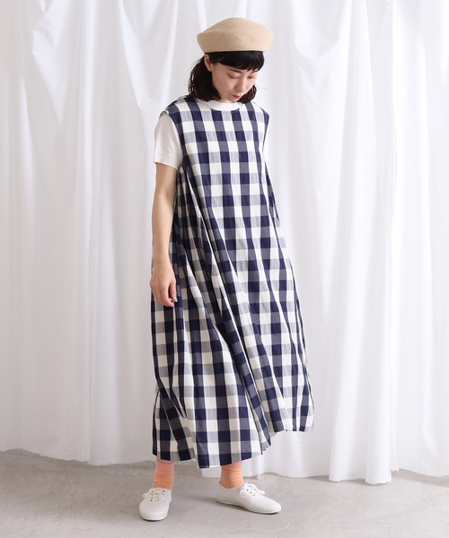 ”いくつあっても嬉しいもの” ギンガムチェックのアイテムっていくつあっても嬉しいものです。 ベーシックな柄を長く着てほしいなという思いで企画をしました。 カポックとは・・・ 東南アジアなどの温暖な地域で採取され、栽培に農薬や化学肥料を使用することが無いためオーガニックコットンのように環境にやさしいサスティナブルな原料です。 ”ホワイトシルクコットン”と呼ばれるほどシルクのような光沢感としなりがある素材で、繊維の中に空気が多く含まれているのでとても軽いのが特徴です。 今回はオーガニックコットンが90%、カポック10%の配合で織りコットン100%より少し上品に仕上げました。 暖かい季節に毎日でも着たいアイテムだからこそ軽く着られてふんわりと涼し気になるようにしました。 カポック混の素材なので落ち感があり ドレープが綺麗に出るため、ボリュームたっぷりのシルエットもすっきりとして見えるように仕上げています。 夏に向けておすすめなノースリーブワンピース 一見シンプルなワンピースですが脇にギャザーをよせ生地をたっぷりと使ったボリューム感のある1枚です。 中にTシャツを重ねたレイヤードスタイルも◎ Lene non finito 2021 spring /summer "日曜日の朝に着る服" 今日は家でゆっくり過ごそうか それとも出かけようか 手の込んだ料理を作ったり のんびりして夕方からやりたいことを考えながら過ごすのも良い 休日の遅めの朝に考える時間のささやかな幸せ ※ブラック色はサンプルです。実際の商品と仕様・加工・サイズ等が若干異なる場合がございます。 ※モデルの着用画像は光の関係で商品の色味が若干異なります。正しい色味は商品詳細の画像をご参照ください。 ※取り扱いの注意については取り扱い表示をよくご確認の上、着用をお願いいたします。