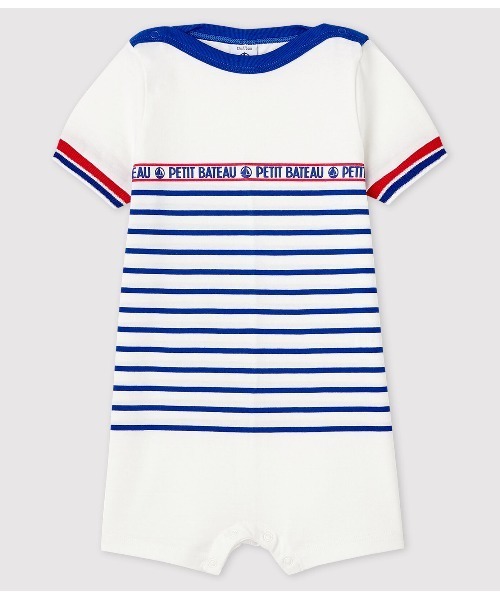 白ベースのトリコロールカラーが目を引く半袖ロンパースです。ブルーのパネルボーダーが、デザインをより爽やかに演出しています。肩口にはスナップボタンが施されているので、元気なベビーのお着替えも簡単なアイテムです。