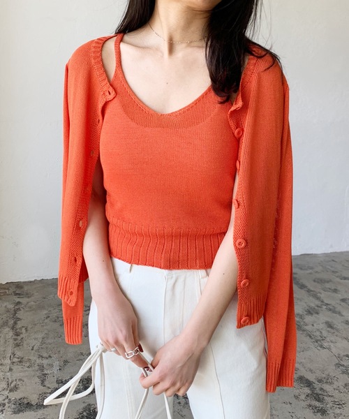 コーディネートの幅が広がる涼やかな素材感のお得なニットキャミソールカーディガンセット【デザイン】シンプルなキャミソールとカーディガンのセットボタンも本体と同色でシンプルで上品にきまります春夏らしい鮮やかなカラー展開です【素材】麻のようなシャリ感のある通気性の良いニット素材------------裏地 なし透け感 あり伸縮性 あり光沢 なしポケット なし洗濯方法 手洗い可------------【スタイリング】アンサンブルでセットで着てもそれぞれ単品で着ても◎キャミソールはジャケットやシアーシャツのインナーにもカーディガンはTシャツに肩掛けするのもオススメシンプルでコンパクトな丈感なのでスカートにもパンツにも合わせやすいですアレンジ次第で様々な着方ができる、着回し力抜群のアイテムです▼もっとお買い物を楽しんで頂く為に▼〈商品のお気に入り登録〉お気に入りの登録をして頂きますとセールの通知・ラスト1点になった時の通知や、再入荷通知を受けることができます。〈ブランドのお気に入り登録〉新商品の発売や再入荷、タイムセールやクーポン発行のお知らせなどLianがお届けするお得な情報を受け取ることができます。