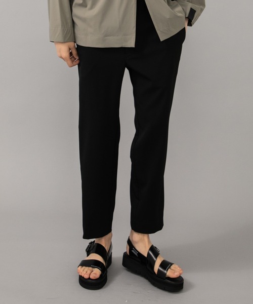 【デザイン】定番で展開するIroquoisの別注テーパードパンツに新色を加えてリリース。こちらはウエストがボタンジッパーフライでイージー仕様になります。ウエストはベルトループなのでタックイン時にベルトを締めていただくとラフな印象から上品な印象に早変わり。丈感もアンクル丈になりますので体系を選ばず様々な方に履きこなしていただけます。今期は定番のブラックに加え、アーストーンのレンガとストライプ仕様になったネイビーを加えた計3色のリリースになります。※ネイビーののみ柄の特性上素材表記が異なりますのでご注意ください。【素材】ブラックとレンガはポリエステルとポリウレタンをメインファブリックを使用。ネイビーカラーはストライプにキュプラを使用しました。ポリウレタンを使用することで生地に伸縮が生まれ、膝を曲げた際などのストレスもなく、特に夏場で活躍が期待できる生地です。