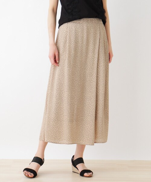 【デザイン】 ドレープ性に富んだスカーチョパンツです。 フロントはラップ風デザインで一見スカート見えしますが、パンツなので足さばきもよく快適に穿きこなせます。 裾幅を広くしてタイト感なくエレガントな雰囲気に。 ランダムにデザインしたドットが洗練された印象です。 ウエストゴム使用で着心地も楽。春~盛夏にむけて使えるアイテムです。 【生地感】 落ち感のあるサラッとしたタッチです。 裾上あたりまでの裏地付き モデル情報:身長167cm B78 W62 H88 着用サイズ:00 店舗へのお問い合わせ商品番号:316-62008 ●製品寸法: 00(FREE):W62~72cm H72cm 股下48cm 前股上36cm 渡り幅39cm 裾幅48cm 備考: