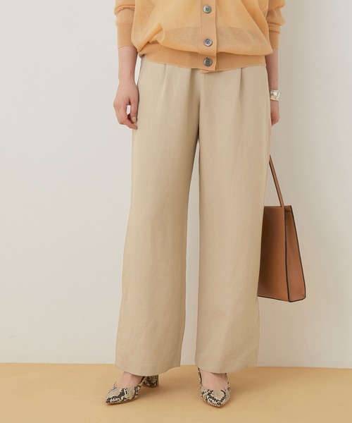 夏のリネン混カラーイージースラックス【Material】 セルロースリネン。夏の定番!涼やかなきれいめリネン混素材。 【Design】 1タック入りのストレートスラックス。 後ろウエストのみゴム入りで着心地楽チンながら、前から見るときちんと見えするパンツ。裾両脇にはベンツあきで抜け感が出ます。 【Color】 大人っぽいシックなライトベージュ、女性らしい華やかなナスコン、フレッシュな夏らしいオレンジの3色展開。 【Styling point】 フォトTEE×オレンジなどのカラーパンツ合わせや、デザインブラウスとの合わせがおススメです。 ---------- 裏地:なし 光沢感:あり 透け感:ややあり ウエスト:後ろ一部ゴム ポケット:あり 伸縮性:なし 生地の厚さ:やや厚手 洗濯方法:ドライクリーニング ボタン:なし ---------- ※アウトレット商品のため、タグにサービスプライス商品の記載がございます。 ※画像の商品はサンプルです。お届けする商品に仕様・サイズ等の変更が生じる場合がございます。予めご了承ください。 ※ロケ撮影画像は光の当たり具合で色味が異なって見える場合がございます。商品の色味はスタジオ撮影の画像をご参照ください。