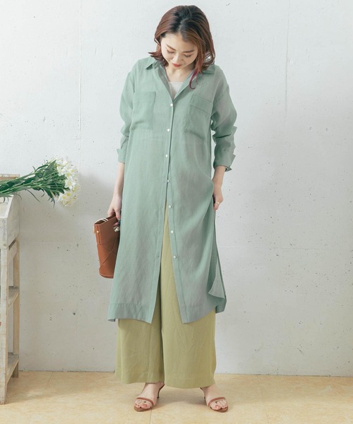 【清涼感溢れるサイドスリットシアーワンピース】リネンライクなシアー素材を使用したロング丈のシャツワンピース。スラブ糸のような節が入っており、ナチュラルな表情ある素材感が魅力です。サイドに深いスリットを施し、軽やかな印象のデザインに仕上げました。ワンピース使いはもちろん、羽織りとして着こなしたり、ワイドパンツやマキシスカートとのレイヤードスタイルも楽しんで頂けます。※この商品は、デザイン性や素材感を重視し、柔らかい風合いのきじを使用しています。激しい動きで強い力がかかったり、他のものに引っ掛かったりすると、滑脱(縫い目が滑って開いたり、縫いしろが抜ける)したり、目寄れ(織り糸が滑って片寄り、織り目が開く)が生じる場合があります。ご着用の際には十分ご注意ください。-----------------------------透け感:あり伸縮性:なし裏地:なし光沢:なしポケット:あり-----------------------------