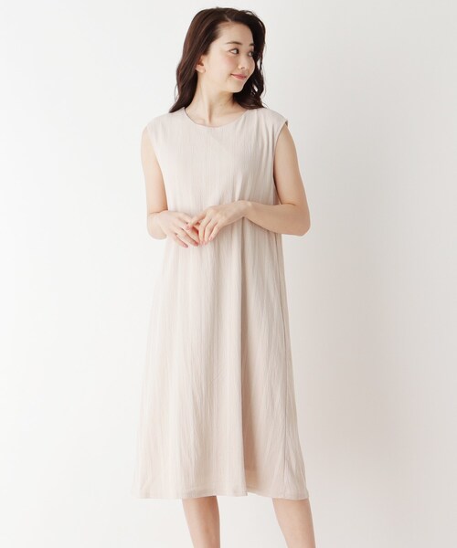 【デザイン】トレンドのカット楊柳素材を使ったノースリーブワンピース。Aラインのミモレ丈で地柄のストライプがタテのラインをすっきり見せます。バックにタックを入れた女性らしいデザインがポイント。シャツやカーディガンを肩掛けするスタイルがおすすめ。※ポケットなし【生地感】程よい肉感とストレッチ性のあるサラリとした生地感です。裾上までの裏地付きモデル情報:身長166cm B78 W59 H86 着用サイズ:38(M)店舗へのお問い合わせ商品番号:763-52226●製品寸法:38(M):総丈110cm B92cm 肩幅41cm W105cm H128cm40(L):総丈111cm B93cm 肩幅41cm W108cm H132cm42(LL):総丈112cm B97cm 肩幅41cm W110cm H134cm備考: