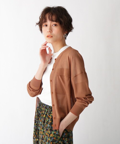 シアー感のある糸を使った、ポケットデザインカーディガン。 【素材】 シアー感が特徴的な編み方をしています。 柔らかく、冷房対策にもぴったりな肉感です。 【シルエット】 クルーネックにふんわりとした短丈シルエットがポイント◎ 肩は程よくおちたデザインでカジュアルな着こなしにもぴったりな一着。 【こだわり】 シンプルになりがちな夏のカーディガンをポケットデザインでこなれた印象に◎ 羽織りとしてはもちろん、前を閉めて一枚着としても◎ ハンドウォッシャブル機能付き。 こちらの商品は主に夏に着用いただける商品です。 モデル情報:身長168cm B74 W58 H84 着用サイズ:38(M) 店舗へのお問い合わせ商品番号:C12-32003 ●製品寸法: 36(S):着丈50cm B102cm 袖丈42cm 肩幅57cm 38(M):着丈52cm B106cm 袖丈45cm 肩幅58cm 備考: