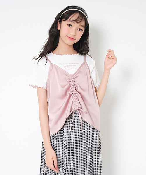 とろみ感のあるサテン生地を使ったキャミソールつきのTシャツです。裾のドローストリングを絞るとギャザーが生まれ、ニュアンスただようスタイリングに♪ テレコTシャツには同カラーのメロウ始末をあしらい、全体にまとまりを持たせました。セットで着るだけでなく、別アイテムとのコーディネートも可能です。