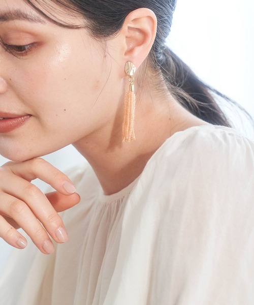 マットビーズなら大人らしさをアピールできる。【デザイン・シルエット】・小粒のビーズを連ねた、ボリューミーなタッセルモチーフのイヤリングです。・幅の調整ができる、ネジ式のクリップタイプ。・アップヘアやショートヘアなど、すっきりとしたスタイルのワンポイントに最適。【カラー】・オフホワイト、パープル、オレンジの夏らしい3色展開。-----------------------------※撮影時の光、お使いのモニター環境によって色の見え方が違う場合がございます。