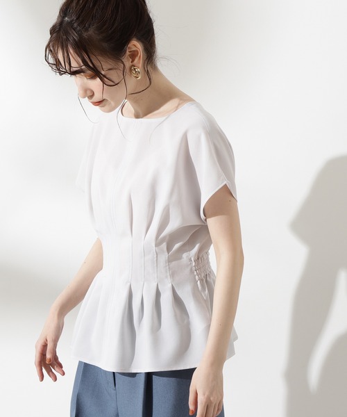 ウエストタックで上品にシェイプされたデザインブラウス。ドライタッチな肌触りと軽やかな着心地でクリーンな印象をプラス。前はシンプルなネックライン、後ろはV開きで抜け感をだしています。バックウエストはゴム仕様なのでフィット感もあり、後ろ姿もすっきり見えします。ヒップが隠れる丈感、ペプラムシルエットを引き立てる女性らしい1枚です。