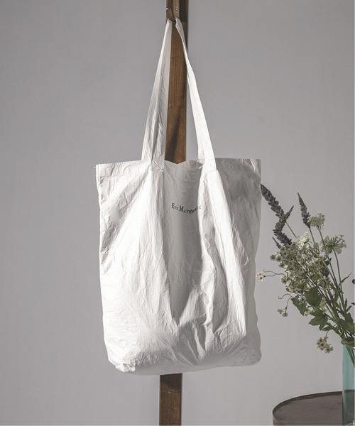 《タイベック素材のデイリーバッグ》タイベックは高密度ポリエチレン100%製の強靭で耐久性のある不織布です。軽くて強靭、耐久性と耐水性に優れており、沢山買い物をしても快適に持ち運べる様に肩から掛けられる仕様です。コンパクトに中のポケットに入れ込んで持ち運びも可能です。【ETS.MATERIAUX / マテリオ】2003年、渋谷のファイヤー通り沿いにオープン。1994年にパリの4区に生まれたANATOMICAのスタイルに共感し、ヨーロッパのメンズファッションの歴史と伝統、品質と機能美の追求をブランドのアイデンティティとしていました。その当時セレクトショップブームの最中にあっても異才を放った存在でありながらも、ETS.MATERIAUXは多くの目利きのお客様に惜しまれながら約5年間でその幕を閉じました。2021年春、当時バイヤーを担っていた金子恵治ディレクションのもと、ETS.MATERIAUXはひとつのブランドとして新たにスタートを切ることになりました。伝統と品質を表現するうえで、新生ETS.MATERIAUXの物作りの中核は2人のデザイナーが担います。ひとりは「outil ウティ」のデザイナーである 宇多悠也氏、もうひとりは「blurhms ブラームス」のデザイナー村上圭吾氏。それぞれのオリジナリティがETS.MATERIAUXの新たな服に息を吹き込みます。当時のETS.MATERIAUXを知る3人のクリエイターが、新たに作り出す新生ETS.MATERIAUXは「経年が着心地の良さにつながり完成していく」をコンセプトに、”ヘルシー”、”コンフォート”、”リラックス”をキーワードに歴史的なウェアを紐解き作り込む事で現代の日常着を再定義します。新生ETS.MATERIAUXが提案する長く愛用することの出来る日常着が、より良い社会や日常の豊かさをもたらします。新たに作り出す新生ETS.MATERIAUXの世界観をどうぞお楽しみ下さい。【ご注意】※商品の色味につきまして、お客様のお使いのPCのモニター環境により実際のカラーと画像の色味が違って見える場合が御座います。予めご了承の上、ご注文下さい。※店頭・外での撮影画像は光の加減で、実際の商品より明るく見える場合が御座います。商品の色味はスタジオ撮影の画像を参考にして下さい。