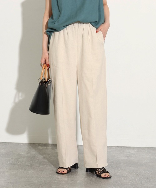 夏らしいコットンリネン素材のワイドパンツです。【STYLING】トップスも綿や麻混の素材がおすすめです。カジュアルにもお仕事にも着用頂ける万能パンツ。シューズやバッグはシーンに合わせて多様なテイストのアイテムを合わせて頂けます。【DETAIL】コットンリネンで夏でも涼しい素材です。センターシームが入っており、見た目はきちんと感がありますが、ウエストゴムで、リラックスできる着心地です。爽やかなオフホワイトとくすみカラーのレッドの2色展開です。裏地有りです。ウエストゴム有りです。※店頭及び屋外での撮影画像は、光の当たり具合で色味が違って見える場合があります。 ※撮影場所やお使いのモニター環境により若干お色味が異なる場合がございます。※サンプルでの撮影のため、実際の商品と色味や仕様の変更がある場合がございます。