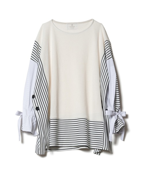 大人気を博したAlpha border CSの第二弾アイテムが登場しました。CS04Donna border CS(ドンナボーダーカットソー)。新色にブラウンを加え、中にも重ねやすい様にボートネックの仕上がりに。首元がスッキリ見え、パンツだけでなくスカートとも相性のいい一枚となりました。袖はリボンとなっていますが、内側にゴムを入れてあるため解かずに着脱できる優れものです。デザイン製もありつつストレスなく着て頂ける一枚を是非!