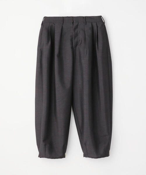 フロント3プリーツと裾のダーツによるバルーンシルエットが特徴のデザインパンツ。高級スーツにも使われる伝統的な英国生地とカジュアルなデザインのコントラスト、生地の耳を使ったバックポケットもポイント。一見して個性的なシルエットだとわかるデザインコンシャスな1着です。■素材1875年に創業したイギリスの老舗〈William Halstead(ウィリアムハルステッド)〉のモヘヤウールトロピカル。英国ならではのしっかりとした打ち込みながら、良質な原毛を使用することにより独特のしなやかさを実現しています。■デザインフロント3プリーツと裾のダーツによるバルーンシルエットが特徴のデザインパンツ。ボックスプリーツ+アウトプリーツの変則的なプリーツ使いなど、他にはないデザインを盛り込んでいます。サンダルとも相性が良いクロップドレングス。2021SS商品店舗にお問い合わせの際は、下記の商品番号をお申し付けください。商品番号:63-04-12-04405