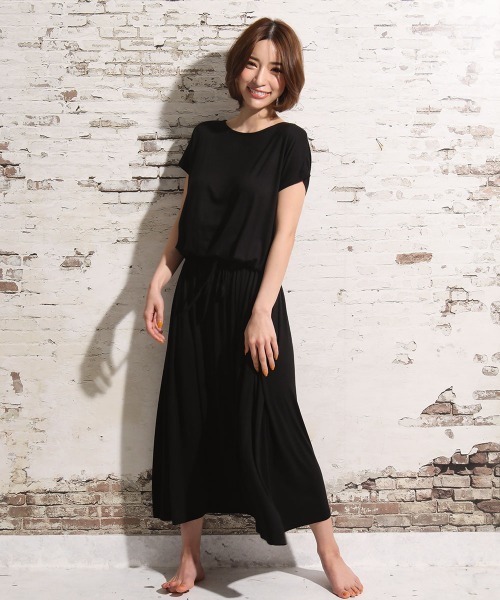 ウエストをキュッと絞ったフレアシルエットが、女性らしさを引き立てるワンピース。落ち感のあるレーヨン素材を使用した滑らかな肌触りで、春夏シーズンを快適に過ごせるアイテム。お部屋でのんびり過ごすときのリラックスウェアとしてはもちろん、ワンマイルウェアとしてもOK。脚を綺麗に魅せるミモレ丈なのも嬉しいポイント!カラーはブラック、モクグレーなどの使いやすい定番カラーと大人カワイイ落ち着いたピンク。 ●サイズ ◆着丈/ウエスト幅 ◇M/123cm/52cm ◇L/127cm/55cm ●素材 レーヨン95%、ポリウレタン5% ●仕様 ウエストヒモ調整可 ●備考 ※薄手の生地を使用していますので、カラーによっては透け感を感じることがあります。 ※ほつれや引っかけの原因となりますので着脱、洗濯の際はご注意ください。 ※デリケートな商品になっております。お取り扱いの際は商品のタグ表記に従ってください。
