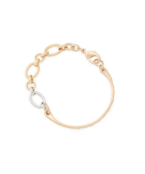 ほどよいデコラティブなデザインが夏らしい。【デザイン・シルエット】 ・メタルバーとチェーンを組み合わせたリッチなバングル。 【カラー】 ・マットな質感のゴールド、シルバーを2色で展開。 【スタイリングポイント】 ・シンプルな白Tシャツや、袖を捲くり上げたルーズなシャツの腕元に合わせると、こなれた大人スタイルに。 ※撮影時の光、お使いのモニター環境によって色の見え方が違う場合がございます。