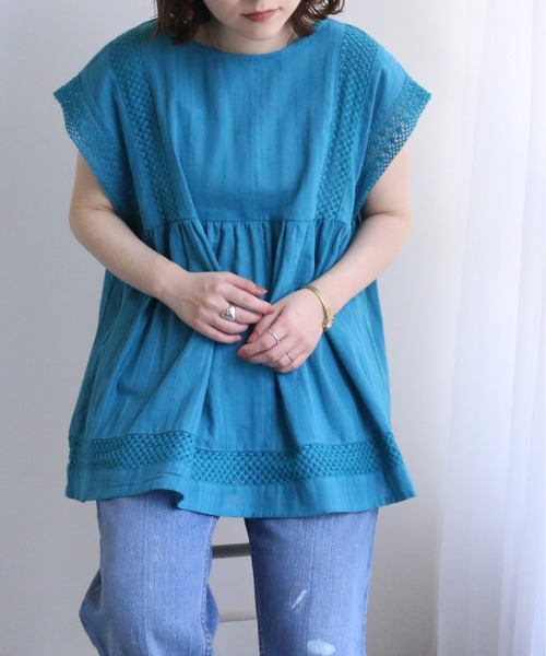 ◆2021 SUMMER◆ 涼しげなコットンレースブラウス。ドビー織の細やかな柄と、袖口と裾のレースがアクセントに。 肩にかかるくらいの袖丈のフレンチスリーブは、二の腕カバーもできます。 サイドから見た時のふんわりシルエットも特徴的。どこから見ても可愛いブラウスに仕上がりました◎ 【STYLING POINT】 腰にかかるくらいの着丈のチュニックブラウスは、ワイドパンツやスキニーなどのパンツスタイルがオススメ。 カジュアルがお好きな方にイチオシの甘くならないレースブラウスです。