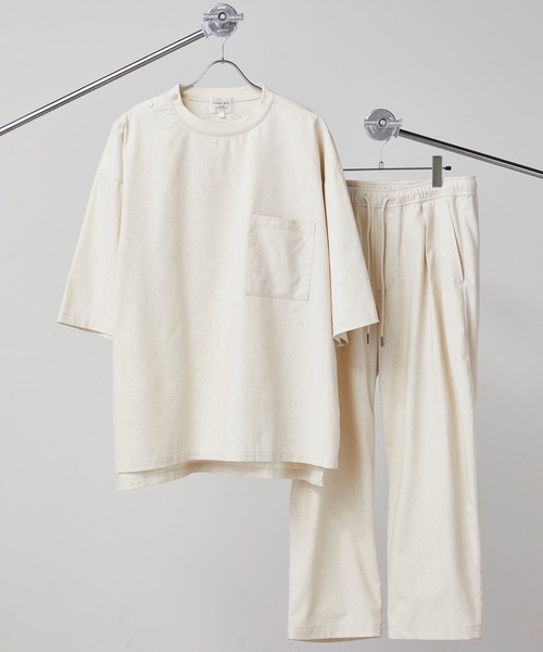 【Loungewear tokyo(ラウンジウェアトウキョウ) 2022 SS COLLECTION】「素材に拘った、今の季節に着て欲しい自信作!」(Tシャツ×ラウンジパンツ2点セット)【セットアップ】麻レーヨンリラックス オーバーサイズ1ポケット半袖Tシャツ&ラウンジテーパードワイドイージーパンツ ワンマイルウェア■デザインゆったりとリラクシングな今季オススメのセットアップが登場。オーバーサイズTシャツとラウンジパンツのセットになっております。オーバーサイズTシャツ:リラックス感のニュアンスをシルエットで取り入れたオーバーサイズなTシャツ。肩ボタンを採用することで、シンプルなデザインの中に遊びを効かせることができ、よりこなれた印象に。。素材由来の上品さが漂う仕上がりで、きれいめコーデ中心の方でも取り入れやすいデザインとなっています。ラウンジパンツ :タックを2つ入れることでもも周りはゆとりがありつつ、裾に掛けてテーパードをきかせることで、すっきりとしたシルエットが楽しめます。シンプルなデザインなので、上品なのに軽やかでスタイリッシュなイメージを打ち出すことができます。ウエストにギャザーが付いていたり、ドローコードでサイズを調整できたりとイージー仕様かつ、クリーンに魅せてくれるパンツです。■素材麻のサラッとした風合いと、レーヨンのしなやかさを合わせ持つ麻レーヨン生地です。しなやかな落ち感の中に、程よいハリ感を持つ生地に仕上がっています。肌にさらりと涼しく、夏の衣料品にとても重宝します。扱いやすく、そして長く愛用することができるアイテムです。■スタイリングルーズなシルエットと色味が爽やかな印象に。素肌がチラッと覗く丈感が足元に軽やかさや抜け感を醸し出し、こなれた着こなしへと導いてくれます。ソックスとのスタイリングも楽しめるので、おしゃれの幅もグッと広がりますあくまでラフに、難しいことを抜きに楽しみたい方にオススメしたい自信作のリラックスウェア。≪お買い物をお楽しみいただくために≫▼商品のお気に入り登録完売カラーの再入荷通知や、ラスト1点の通知、セールの通知も受け取ることができます。▼ブランドのお気に入り登録新商品や再入荷等、いち早くブランドのお得な情報を受け取ることができます。【Loungewear tokyo】大人の普段着をクリーンにランクアップする「メンズラウンジウェア」セレクトショップ。高品質で暮らしをより快適にするための豊富なアイテムを提案していきます。