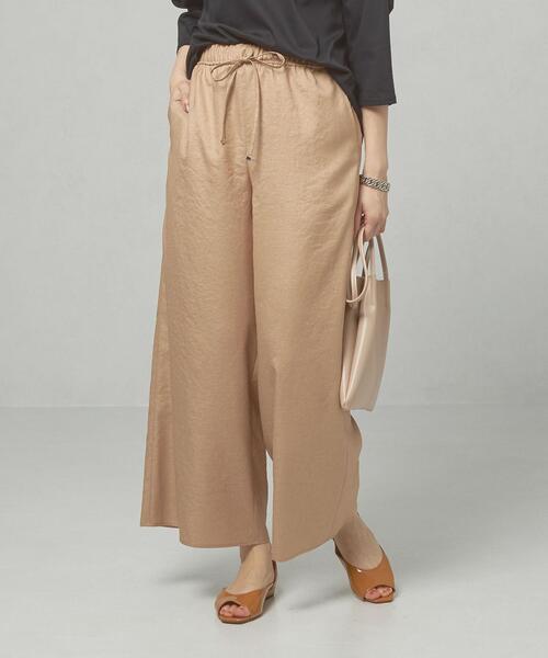 程よい光沢感のポリエステルツイル素材で仕立てたワイドシルエットのパンツ。 さらりとした質感が肌触りが良く、ゆとりのあるサイズ感も相まって夏を快適にお過ごしいただける一枚。 バックポケットがアクセントになり、ウエストゴムとドロスト仕様は楽な履き心地に加えて、インスタイルも綺麗に魅せるデザインです。 シンプルなトップスから、チュニックやワンピースのレイヤードにもお使いいただけます。 <ma couleur(マ クルール)> 2020autumn/winterよりスタート。 情報過多な現代の女性達に向けた、日々を楽しむための強さと華やかさを兼ね備えたブランドです。 店舗へお問い合わせの際は、 全国のTHE STATION STORE各店舗まで下記の品番をお申し付け下さい。 品番:6914-599-0240