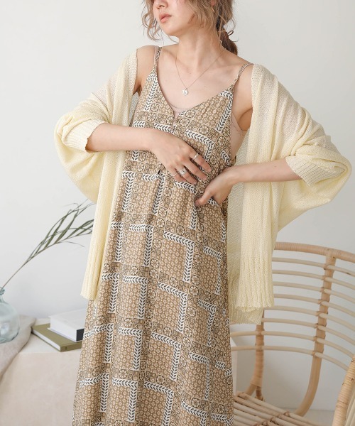 ●Bab●■POINTパネル柄と胸元のボタンが目を引くキャミワンピース!バックに肩紐をつなぐ紐が施されており、肩紐がずれ落ちることなく安心して着て頂けます。裾にスリットが入っているので、抜け感も◎カーディガンなどのアウターを羽織れば、長い間着用可能です。■FABRICレーヨン100%の生地を使用しているので、肌触りが良く着心地◎■COORDINATETシャツやカットソーを合わせるのはもちろん、トップスを上に重ねてスカートのように見せても◎スニーカーからヒールサンダル、フラットシューズなど足元で変化をつけるのもおすすめです。…………………透け感:なし(光に当たると少し透けるので、透け感が気になる方はペチコートの着用をお勧め致します。)裏地:なし…………………※撮影環境により、多少実際のカラーと異なる場合がございます。また、携帯やスマートフォン、パソコンなどの画面上と実物では多少色が異なって見える場合がございます。ご了承下さいませ。※画像の商品はサンプルのため、実際の商品と若干仕様が異なる場合がございます。※濃色品は、過度な摩擦や濡れた状態での摩擦により、色落ち・色移りをする恐れがあります。※この商品は、素材の特性上、洗濯の際に多少の縮みが生じる恐れがあります。洗濯後は形を整えてから干してください。※その他お取り扱いに関しましては、商品に付属のアテンションタグをご覧ください。★商品のお気に入り登録再入荷やラスト1点のお知らせ、セール情報などお知らせを受け取ることができます!★ブランドのお気に入り登録新商品や再入荷などのお得な情報を受け取ることができますので、是非ご登録ください。