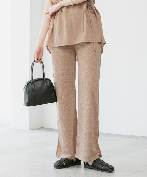ラフさと上品さを兼ね備えたリネン混パンツ ■デザイン 涼しげな麻混素材とさらりとした肌触りが特徴のワイドパンツ。 汗ばむ季節も爽やかに着用いただけるアイテムです。 シンプルに着こなすだけでも抜け感のあるスタイリングが完成するリラックスパンツ。 程よいフレアシルエットとサイドのスリットが脚をきれいに見せてくれます。 ウエスト部分はゴム仕様になっているので着脱が簡単なのもうれしいポイント。 また、ゆったりとした履き心地なのでオンオフ関係なくご着用いただけます。 ■スタイリング ビッグシルエットのTシャツやスウェットなど、メンズライクなアイテムと相性◎ サイドスリットが脚をきれいに見せてくれるので、カジュアルなコーディネートに上品さをプラスします。 また、ハイウエストなのでトップスをインしていただくと足長効果も期待できます。 女性らしいコーディネートにはセットアップ対応のカットソーが◎ こなれ感のあるリラックススタイルが完成します。 ■POINT ・ウエストゴムで着脱簡単 ・サイドスリット入りで美脚効果あり ・通気性の良い軽やかな麻混素材を使用 ※屋外での撮影画像は、光の当たり具合で色味が違って見える場合がございます。また、ご覧になっているデバイスやモニター環境によって、実際の色味と多少異なって見える場合がございますので予めご了承をお願い致します。 ≪お買い物をお楽しみいただくために≫ ▼商品のお気に入り登録 完売カラーの再入荷通知や、ラスト1点の通知、セールの通知も受け取ることができます。 ▼ブランドのお気に入り登録 新商品や再入荷等、いち早くブランドのお得な情報を受け取ることができます。 ※取り扱いについては、商品についている品質表示でご確認ください。