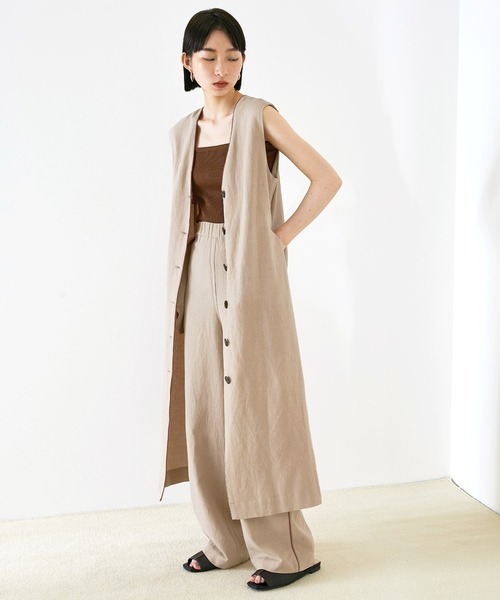 - EMMA エマ 2021 SUMMER COLLECTION - 1着でコーデの幅が広がる前後2WAY 細部にまでこだわったノースリーブワンピース 【ファブリック】 さらっとした質感に加え、通気性が良く吸湿・吸水性に優れており軽やかな着心地。 リネン混の素材は着るほどに肌に馴染み、ナチュラルな風合いが増していくのも魅力です。 【ディテール】 カラーにこだわったパイピングは華やかな印象をプラスする、スタイリングに加えるだけでこなれた雰囲気。 前後2WAYで着用していただけることによりコーデの幅広がり ワンピースとしてだけでなく、ボタンを開けて羽織のアイテムとしてお使いいただけます。 マーブル柄のボタンはトレンド感を演出し、オシャレ度を高めてくれます。 【シルエット】 ストンと縦に落ちるIラインシルエットとロング丈はスッキリと着こなせます。 お手持ちのベルトでウエストマークをしてシルエットに女性らしいラインが生まれトレンドライクな着こなし方がおすすめです。 <セットアップで着用可能なパンツ> 商品名:【EMMA】リネン混パイピングイージーパンツ 商品コード:56638237 ブランド品番:EMpt582 【EMMA|エマ】- EMMA CLOTHES レディースライン - 都会的で洗練されたウェアを基調とし、伝統的なデザインや魅力的な着こなしの提案など、現代に合った理想のバランスを追求するコンテンポラリーブランド。 これからの新たなヴィジョンとして、「今」に落とし込んだ形を作り出し、進化と発展をしていきます。
