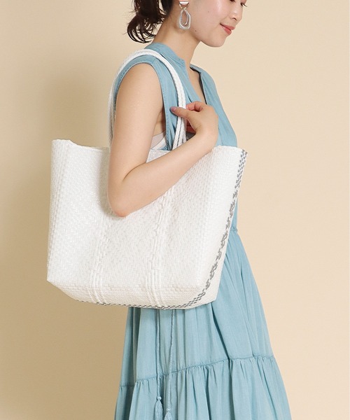 【Moon Bird☆メルカドバッグSIDE LINE M】①スタイリングを選ばないマチ部分のみの柄で洗練された印象。②無地面がメインでありながらちらっと見える柄感がおしゃれです。③肩掛けしやすいリングショルダータイプ。