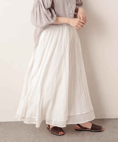 ピュアルセシン 2021 Spring collection 【with a Breeze】 新しい価値観の生活の中でこそ、ピュアルらしさのモノづくりの持続とその中にも、エフォートレスな気分、「with a Breeze」風をまとい、丁寧な暮らしに寄り添える、洗練されたスタイリングの提案 ◇可愛いボリューム感♪涼しげなボイルスカート◇ 見た目以上に穿くとボリューム感のあるスカート。 そのボリューム感で、しっかり体型をカバーしてくれます。 そして、フワッと広がるシルエットは、女性らしさを思い切り引き出してくれます。 何重にもなっている生地+裏地で、明るいカラーでも大きく透ける心配はございません。 ブラウスと合わせての綺麗めスタイルや、カットソーを合わせてのカジュアルスタイルもオススメ。 合わせるアイテムにより、幅広いスタイリングが叶う1枚です。 ・安心の裏地付き ・ウエスト総ゴムでお腹周りも楽ちん ・コットン100% ・柔らかい肌触りでストレスフリー ============================= 透け感:なし 裏地:あり 伸縮性:なし 光沢感:なし 生地の厚さ:やや薄手 【スタッフコメント】 年齢:20代前半/身長:157cm/普段着用サイズ:Mサイズ サイズ感:ウエスト総ゴム+ゆったり身幅でストレスフリーなサイズ感です。フワッと広がるシルエットは夏に持っていたい1枚。 素材感:コットン100%の生地で、柔らかく滑らかな肌触りです。裏地付きなので、大きな透け感はありませんが、色の濃いアイテムとの合わせは避けた方が良さそうです。 ============================= ※撮影場所やお使いのモニター環境により若干お色味が異なる場合がございます。特にロケの撮影では明るく見える傾向にございます。 ※予約商品はサンプルで撮影をしております。若干の仕様が変更になる場合がございますので予めご了承の上ご注文くださいますようお願いいたします。