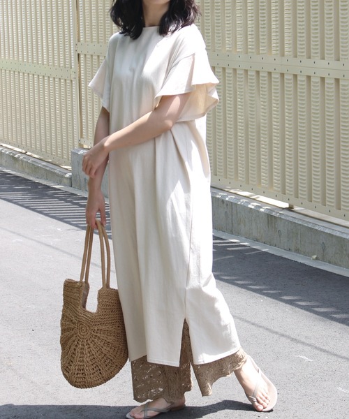 ◆ふわっと揺れるフリルスリーブワンピース◆ 動く度にゆれるフレアスリーブが女性らしさを演出してくれるワンピース。長めの袖が気になる二の腕をカバーしてくれます。 ワイドパンツやレギンス、デニムとのレイヤードスタイルもぴったり。リラックス感があり、デイリーに活躍する1枚です。 *抜け感のある裾スリットデザイン *リラックス感ある着心地/綿100% ◆LAVEANGE◆ ■商品注意事項■ ※屋外での撮影画像は、光の当たり具合で色味が違って見える場合があります。商品の色味は、スタジオ撮影の画像をご参照ください。 ※商品写真はできる限り実物の色に近づけるよう加工しておりますが、お客様のお使いのモニター設定、お部屋の照明等により実際の商品と色味が異なる場合がございます。 ※末永く愛用頂く為に、アテンションタグ・洗濯ネームを必ずご確認の上、着用又はお取り扱い下さい。