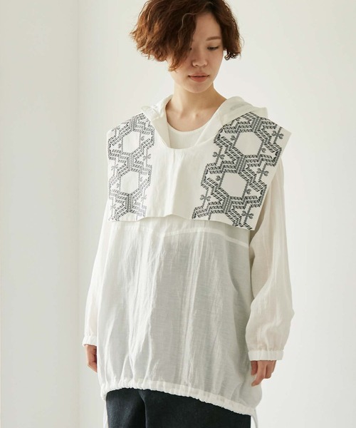 グラフィカルながらも、トライバルムード漂うオリジナルの刺繍。スウェーデン刺繍にインスピレーションを受けながらも、エッジーに仕上がるよう、緻密さと大胆さを意識して一から柄を作りました。グレー / 黒 / その他 → レーヨンブライト糸白 → シルバーゴールドのラメ糸のカスリの糸甘さ控えめクリーンヴィンテージムード漂うアイテムに仕上げました。その他(シロ×チャコール)はWEB別注色です。夏のTシャツに映えるような、甘さ控えめのつけ襟。何てことないTシャツ、デニムとぺたんこサンダルに合わせてサラッと取り入れてみたい。秋のスウェットやニットスタイル、ブルゾンの上からつけてみたり。斜め掛けや、腰に巻き付けてみたり。遊び心効かせたスタイリングを楽しんで。洗濯:手洗い可※画像はサンプルです。実際の商品と仕様・加工・サイズ等が若干異なる場合がございます。※撮影画像は光の当たり具合やモニターの環境により色味が違って見える場合がございます。※取り扱いの注意については取り扱い表示をよくご確認の上、着用をお願い致します。
