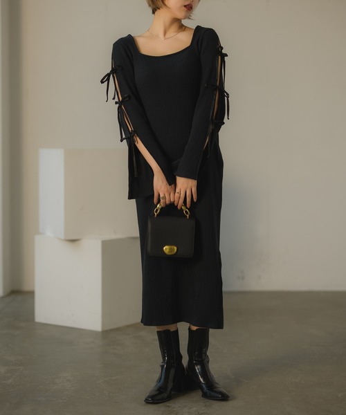スタイルアップを叶えるスリットワンピース [デザイン] 美しいシルエットと袖のリボンにこだわったワンピースです。 伸縮性のあるリブ素材でストレスフリーで着れるのも嬉しいポイント♪ デコルテがキレイに見えるよう前はスクエアネック、後ろはUネックとバックスタイルにこだわりました。 袖のリボンはアクセントになるようにサテン生地を使用し華やかな印象に☆ またリボンは調節できるので袖をゆったりさせる事も出来ます。 サイドにはスリットが入っているのでロングでもスッキリとした印象で来ていただけます。 [スタイリングポイント] ショート丈のジャケットと合わせてスタイルアップコーデがオススメです♪ ショートブーツやスニーカーでカジュアルダウンしたコーデも◎ トレンチコートなどロングコートもオススメです! ---------------------------------------------------------- ▶商品のお気に入り登録 完売カラーの再入荷通知やラスト1点の通知など お得なプライスダウンの情報も受け取ることができます。 ぜひご登録ください◎ ▶ブランドのお気に入り登録 新商品や再入荷など、ブランドの最新情報を いち早くお知らせします! ぜひご登録ください♪ ---------------------------------------------------------- ※撮影環境の光や角度により、実物と色味が異なる場合がございます。 また表示のサイズ感も実物とは若干異なる場合もございますので、予めご了承ください。 ※着用、お取り扱いの際は、商品に付いている品質表示を必ずご確認ください。