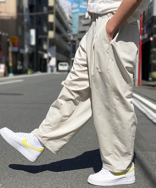 21S/S Item ダブルタックでワイドなシルエットが引き立つボトムス 【デザイン】 ウエスト後ろ部分にはゴムを入れ、イージーパンツ仕様に。 またドローコード、ベルトループも採用し、機能面もプラスしています。 ダブルタックにより、腰回りにゆとりを持たせながらも、裾に向かってテーパードをかけた綺麗なシルエットです。 【ファブリック】 夏でも涼しく穿ける、軽量でソフトな風合いに独特なシボ感の素材を使用し、幅広いシーズンで活躍します。 【コーディネート】 パンツを活かしたシンプルな組み合わせもオススメですが、オーバーサイズのトップスをタックインしたトレンドの組み合わせがオススメです。 ワイドなシルエット、イージーパンツ仕様により、カジュアルからストリートまで幅広い着こなしが出来、男女共に着用できる点も嬉しいポイントです。 ------------------------- 【KGFR カガフリ】 "アーバンナチュラル"をコンセプトに、サーフ,ストリート,カルチャーを中心としたクロージングブランド。 フォトグラファーの横山泰介氏、三浦安間氏らが参画し、独自の世界観を発信する。 【KAGAFURI KAMAKURA カガフリ カマクラ】 世界に日本の古都として認知される鎌倉の価値を、再認識し広げる取り組みとして2018 年より始動した「カガフリ カマクラ」。 "鎌倉プラウドを世界へ"を合言葉に、鎌倉出身で活躍する写真家、クリエーター、企業、自治体が協力したジョイントプロジェクトである。 地域の名を冠するブランドとして、鎌倉の伝統や文化をフィーチャーしたアートピースをファッションで表現・発信し、地域創生を目指す。