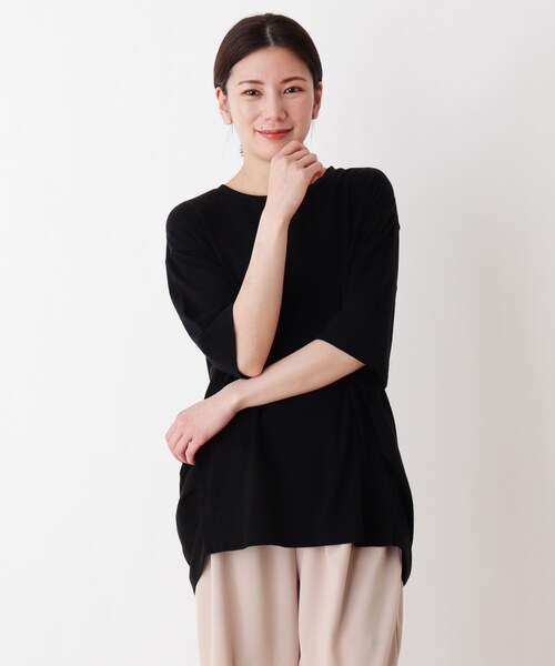 【デザイン】 肌触りの良いSUPIMAコットン(綿)シリーズに2021年バージョンのプルオーバーが登場! 脇に入れたタックを入れて立体感を出したコクーンシルエットに。一枚でサマになるデザインです。 すっきりとした素材なのでタックがきれいに見え、コーディネートのポイントになります。 羽織りものを邪魔しない5分袖デザインもポイントです。 【生地感】 SUPIMAコットン(綿)とは アメリカ南西部のアリゾナ州などで栽培される35mm以上の長い繊維長(せんいちょう)をもつ高級綿のことです。 ごくわずかしか取れない希少性から「綿のカシミヤ」とも呼ばれ、世界中で高く評価されるコットン(綿)。 吸湿性が高く、柔らかくしなやかな風合いで、絹のような美しい光沢感があります。 コットン(綿)は繊維長が長いものほど高級とされており、アメリカ産で最高級の品質を誇るのがピマ・コットンで、「スーピマ」は、Superior pima(高級ピマ)の略で、米国スーピマ協会の登録商標にもなっています。 こちらのアイテムは、もちっとしたタッチになるよう、スーピマコットン(綿)にポリウレタンを混紡し、落ち感のある上品な素材に仕上げています。 ※ホワイト(002)は透け感があるため、インナーの着用をおすすめします。 【サイズ】 大きいサイズ(LL)の展開あり。 ※04(LL)サイズはWEB限定サイズです。 モデル情報:身長167cm B78 W62 H88 着用サイズ:02(M) 店舗へのお問い合わせ商品番号:C62-12117 ●製品寸法: 02(M):着丈70cm B106cm 袖丈27cm 肩幅51cm 03(L):着丈73cm B110cm 袖丈28cm 肩幅52cm 04(LL):着丈76cm B114cm 袖丈29cm 肩幅53cm 備考: