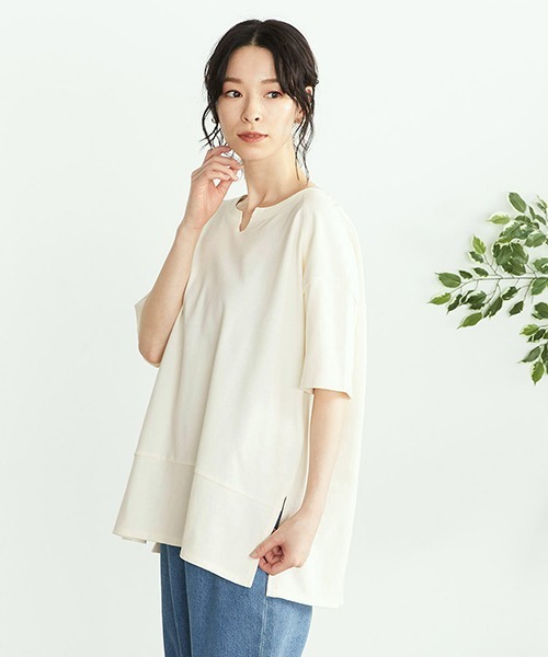 ◆ONIGIRI(おにぎり)の鹿の子 キーネックTシャツ◆《素材》 さらりとした肌触りの、コットン鹿の子素材です。 鹿の子素材は、表面に小さな凹凸があることで通気性が良く、肌との接地面が少ないので、さらりとした肌触りが特徴。 綿100%で吸水・速乾性に優れ、デイリーに活躍します。 《デザイン》 ボックスシルエットで、リラックスした着心地のキーネックTシャツです。 あきすぎないキーネックで、デコルテに程よい抜け感をプラス。 サイドスリットを深めに入れて、軽やかな印象を加えました。 そのため、前だけトップスインした着こなしもおすすめ! 肩線を前に振っているので縫い代が肩に当たらず、ストレスのない着心地です。 ※画像の商品はサンプルとなりますので実際の商品と仕様、加工、サイズが若干異なる場合がございます。 ※こちらの商品はFIVE FOXes独自の採寸方法となっています。 本サイトのサイズガイドと採寸方法が異なる場合がありますのでご了承ください。