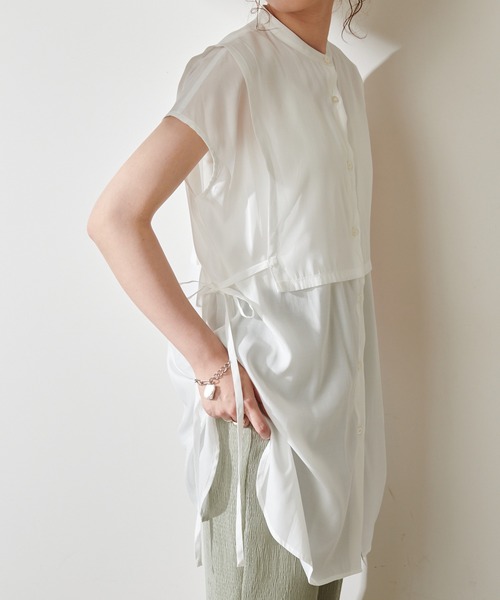 \\WEB限定アイテム!!//人気のレイヤードブラウスにノースリーブが登場!POINTバンドカラーですっきりした印象の身頃は、一枚でアクセントになるレイヤード風デザイン。横からの姿も抜かりなく、ベストを重ね着しているかのようなディティールがポイントです。ボディーラインをしっかりカバーしつつ、メリハリのある着こなしを叶えてくれます。COORDINATE細身のパンツと合わせてバランスよく着こなしたり、柄物のパンツでアクセントをつけた着こなしも旬のスタイルになります。落ち感のある風合いなので、しっかりした生地感のボトムスでもバランス良く着こなせます。*************透け感:なし伸縮性:なし光沢感:ややあり生地の厚さ:やや薄い*************※ご覧のモニター環境や撮影環境により実際の商品と多少色味が異なって見える場合がございます。【お気に入り登録がオススメ!】●商品のお気に入り登録「在庫残りわずか」の通知や、「完売カラーの再入荷」、「セール」の通知を受けることができます。●ブランドのお気に入り登録新商品や再入荷等、ブランドのお得な情報を受け取る事が出来ます。
