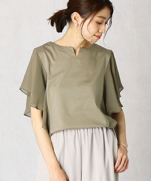《素材》ジャージ素材に、シフォンフリルを組み合わせたデザインカットソーです。 《デザイン》 フリル丈は二の腕が隠れる長さで、1枚でもサマになるデザイン。 胸元は、キーネックでスッキリとした印象にしました。 着丈はボトムを選ばない様に、前後差を付けています。 ジャージ素材なので、着心地が良く、エレガントになりすぎないのでカジュアルなスタイリングにもおすすめです。 ※画像の商品はサンプルとなりますので実際の商品と仕様、加工、サイズが若干異なる場合がございます。 ※こちらの商品はFIVE FOXes独自の採寸方法となっています。 本サイトのサイズガイドと採寸方法が異なる場合がありますのでご了承ください。