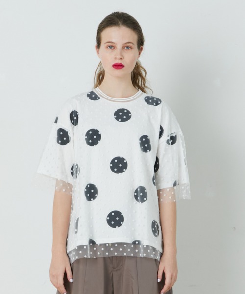 ドットやボーダー柄のカットソー素材の上に、繊細な見え方のするドットチュールを重ねあわせて衿くりでつなぎ合わせたエアリー感とシアーな表情が可愛いカットソー。ゆったりとしたシルエットにややチュールを長めに重ねる事で透け感を出し、動きのでるデザインに仕上げています。 衿にはオリジナルで編んだ透け感のあるリブが顔周りをスッキリと見せ、大人でモードな雰囲気もつくっています。 ベースのドット柄もあえて大きめにする事で甘過ぎないポップな印象にしていたり、ボーダー柄はベーシックな間隔にする事で着やすさを出しています。