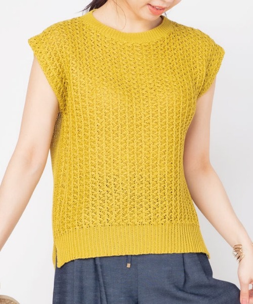 2021SS ナチュラルな風合いが魅力のノースリーブニット 【デザイン】 麻のようなナチュラルな風合いが涼しげなギマニット。前身頃はざっくりとした編地で夏らしい印象に。ボクシーなシルエットでカジュアルな表情ながらもコンパクトな襟元がクリーンな雰囲気の1着。女性らしい印象を与えてくれるフレンチスリーブの仕様で二の腕をすっきりカバーしてくれます。 【素材】 麻のような風合いの綿の糸を使用しているのでとても軽く,暑い日にもぴったりのサマーニットです。 【スタイリング】 タンクトップ感覚で一枚で着用するのはもちろん,Tシャツなどとレイヤードしてベストとして着るのも◎幅広いスタイリングでデイリーに活躍するアイテムです。 ※画像の商品はサンプルです。実際の商品と仕様,加工,サイズが若干異なる場合がございます。 ※撮影時の照明の関係により,実際よりもやや明るく見える場合がございます。お色味に関しましてはご詳細画像にてご確認ください。またパソコンなどの環境により,製品と画像のカラーが若干異なる場合もございます。予めご了承ください。