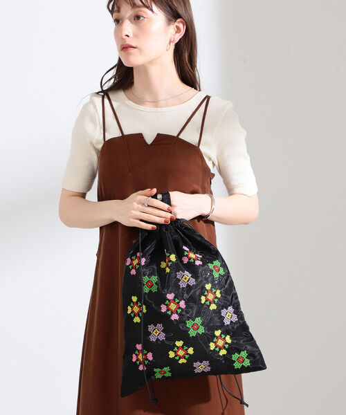 フラワーモチーフの刺繍がポイント春夏のスタイリングに欠かせないチュール素材を使用した巾着バッグが登場。色味を抑えたオフホワイトと、カラフルな刺繍のブラック、どちらも欲しくなる2色をご用意しました。大きめのサイズなので夏のレジャーシーンにも◎。