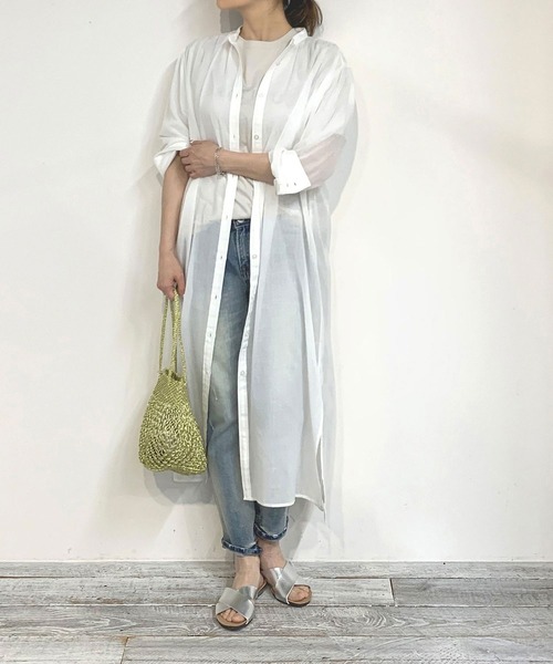 着心地軽やかで清涼感のある、 夏に使えるシアーロングシャツ 程よい透け感が大人っぽいシアーロングシャツです。 ふんわりとしたシルエットに仕上げ女性らしさをプラス。 柔らかく、軽さのある生地感は清涼感もあり、 夏のコーディネートにぴったりな1枚です。 ■point ・程よい大人のシアー感 ・リラクシーな着心地 ・冷房対策の1枚に ■detail ・ギャザーを入れることで女性らしいドレープを演出 ・トレンド感あるパフスリーブも大人のボリューム感に 仕上げました。 ・エアリーな生地感 ■fabric 清涼感、程よい透け感、エアリーな風合いがポイントのボイル素材 ボイル・・・ボイル(voile)はフランス語。 英語ではベール(veil)を意味する言葉。 透けた雰囲気の薄手の生地・素材を意味することが多いです。 …………………… 透け感:あり 裏地:なし 伸縮性:なし 光沢感:ややあり 生地の厚さ:薄い …………………… ※詳しいお手入れ方法は商品タグをご参照ください ■coordinate ・ガーゼの様にエアリーな素材かつ透け感もあるので ボタンを閉めて着ても、重い印象にならずに着て頂けます。 ・前を全て開けて羽織として合わせて頂くのもおすすめです。 ※屋外での撮影画像は、 光の当たり具合で色味が違って見える場合があります。 商品の色味は、スタジオ撮影の画像をご参照ください。
